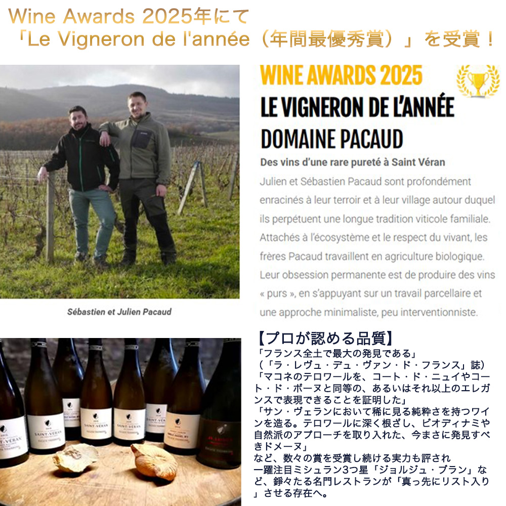 ブルゴーニュ辛口白ワイン愛好家大注目!Wine Awards 2025年にて「Le Vigneron de l'annee(年間最優秀賞)」を受賞!今、世界のワイン業界が注目し、トップインポーターが争奪戦を繰り広げている生産者パコー・ヴィニョロン!自然派・ビオロジック・有機 (ビオディナミ) (エコセール認証) (SO2の使用は必要最小限) の究極サン・ヴェラン!レストラン様からのリピート多数の辛口白ワイン!