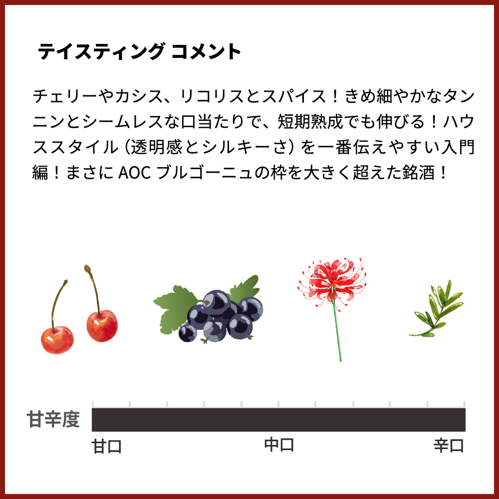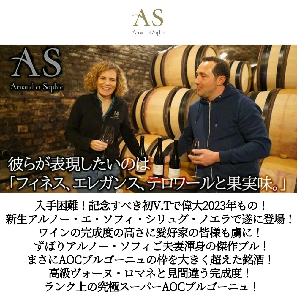 チェリーやカシス、リコリスとスパイス!きめ細やかなタンニンとシームレスな口当たりで、短期熟成でも伸びる!ハウススタイル (透明感とシルキーさ) を一番伝えやすい入門編!まさにAOCブルゴーニュの枠を大きく超えた銘酒!新生アルノー・エ・ソフィ・シリュグ・ノエラでリリースされる記念すべきファーストヴィンテージで、スーパーグレイトヴィンテージ[2023]年もので超限定で極少量入荷!