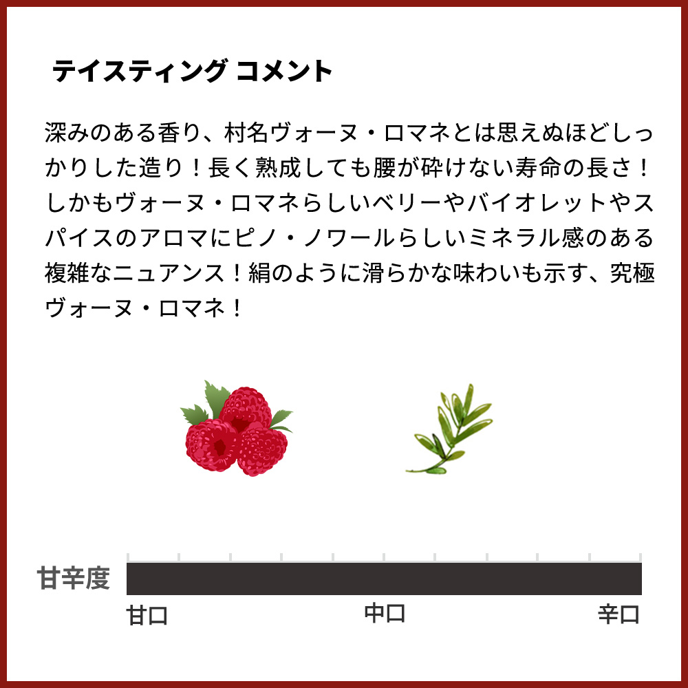 深みのある香り、村名ヴォーヌ・ロマネとは思えぬほどしっかりした造り!長く熟成しても腰が砕けない寿命の長さ!しかもヴォーヌ・ロマネらしいベリーやバイオレットやスパイスのアロマにピノ・ノワールらしいミネラル感のある複雑なニュアンス!絹のように滑らかな味わいも示す、究極ヴォーヌ・ロマネ!