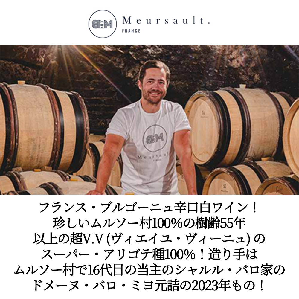 ムルソー村100%の南-南西向きの粘土質が多めの石灰土壌畑の樹齢驚異の55年のアリゴテ種100%を天然酵母100%で発酵、マロラクティック発酵後バトナージュをせずオーク樽100%で約12ヶ月樽熟成で造られる究極ブルゴーニュ・アリゴテAOC!