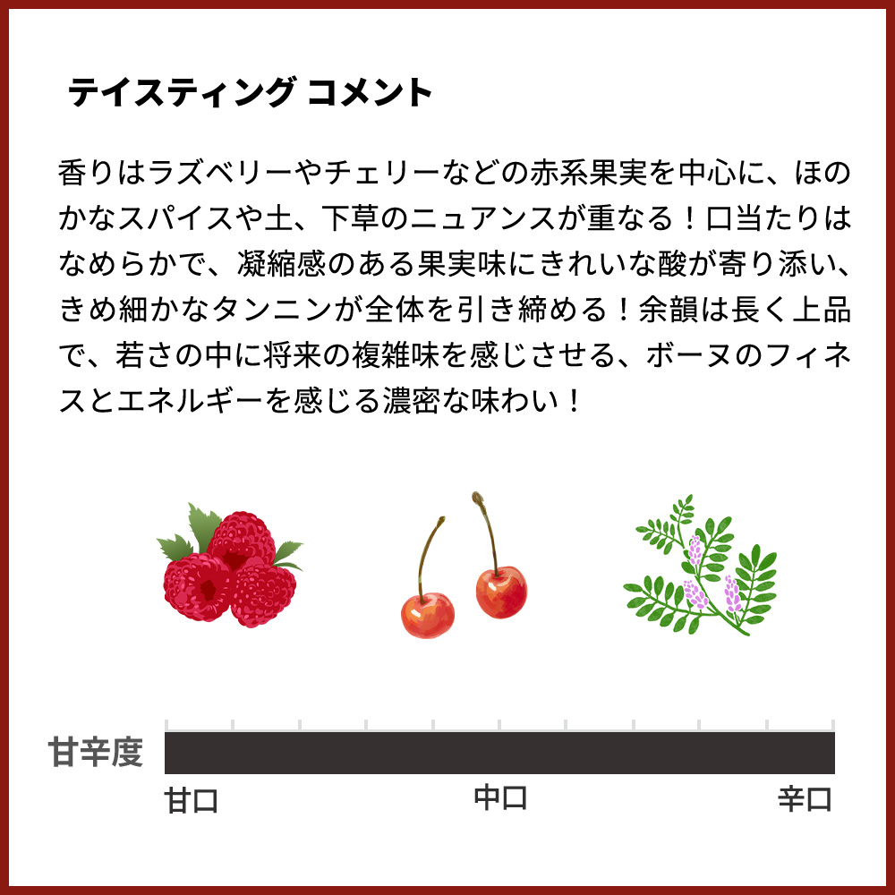 2017年らしい熟した果実味とエレガンスを兼ね備えた味わい!香りはラズベリーやチェリーなどの赤系果実を中心に、ほのかなスパイスや土、下草のニュアンスが重なる!口当たりはなめらかで、凝縮感のある果実味にきれいな酸が寄り添い、きめ細かなタンニンが全体を引き締める!余韻は長く上品で、若さの中に将来の複雑味を感じさせる、ボーヌのフィネスとエネルギーを感じる濃密な味わい!今後の熟成にも期待できる一本!