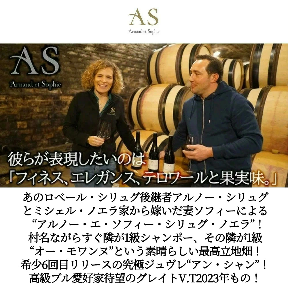 ずばりアルノー・エ・ソフィー・シリュグ・ノエラによる究極ジュヴレ・シャンベルタン!しかもジュヴレ・シャンベルタンの人気畑“アン・シャン”!村名ながらすぐ隣が人気一級畑シャンポー!その隣が大人気一級畑“オー・モワンヌ”!その隣が一級カズティエという、素晴らしい最高立地畑で、長期熟成のポテンシャルが高い偉大な村名畑!
