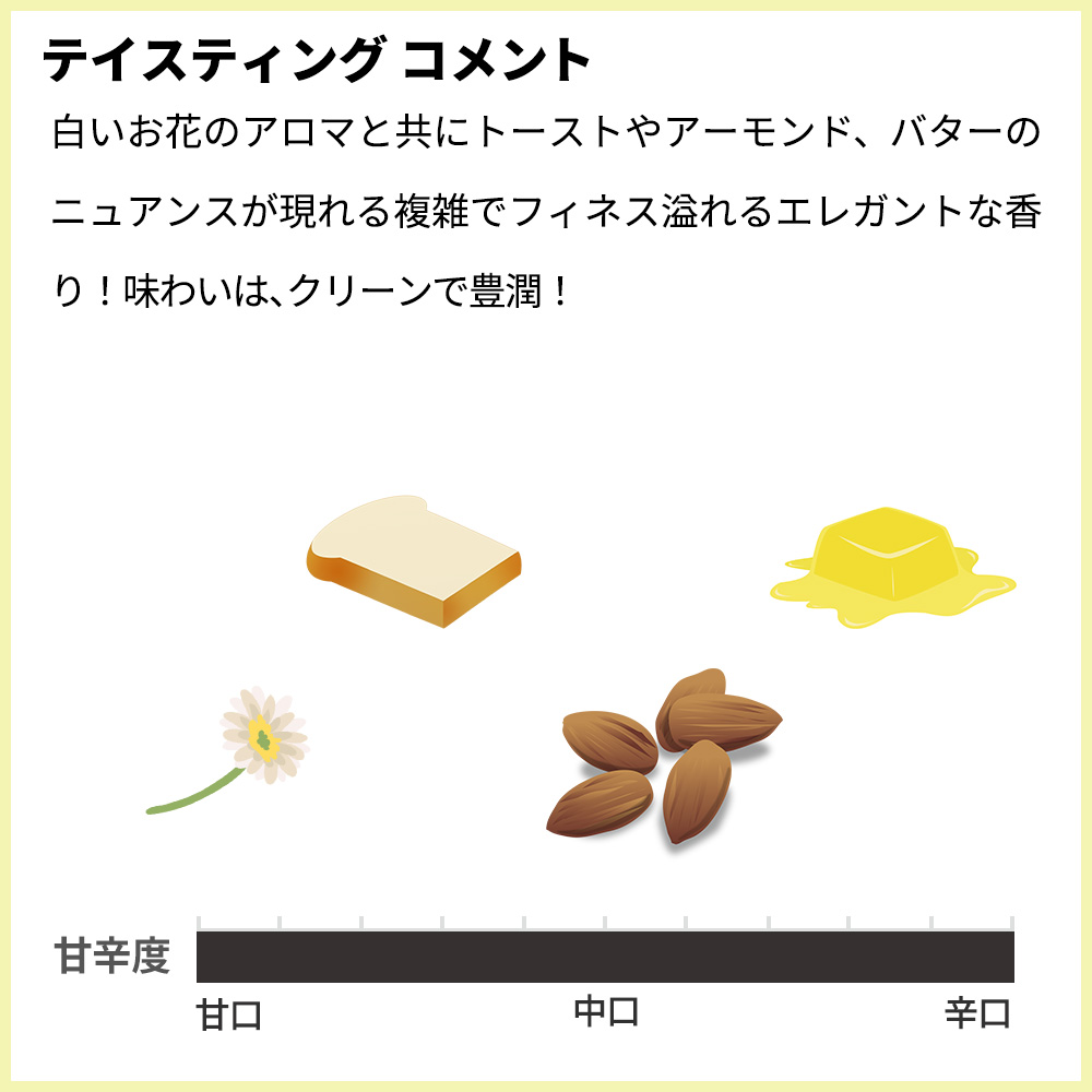 ■発酵・熟成:フレンチオーク樽11ヶ月(仏産228L、新樽比率80%)熟成、ステンレスタンク5ヶ月熟成