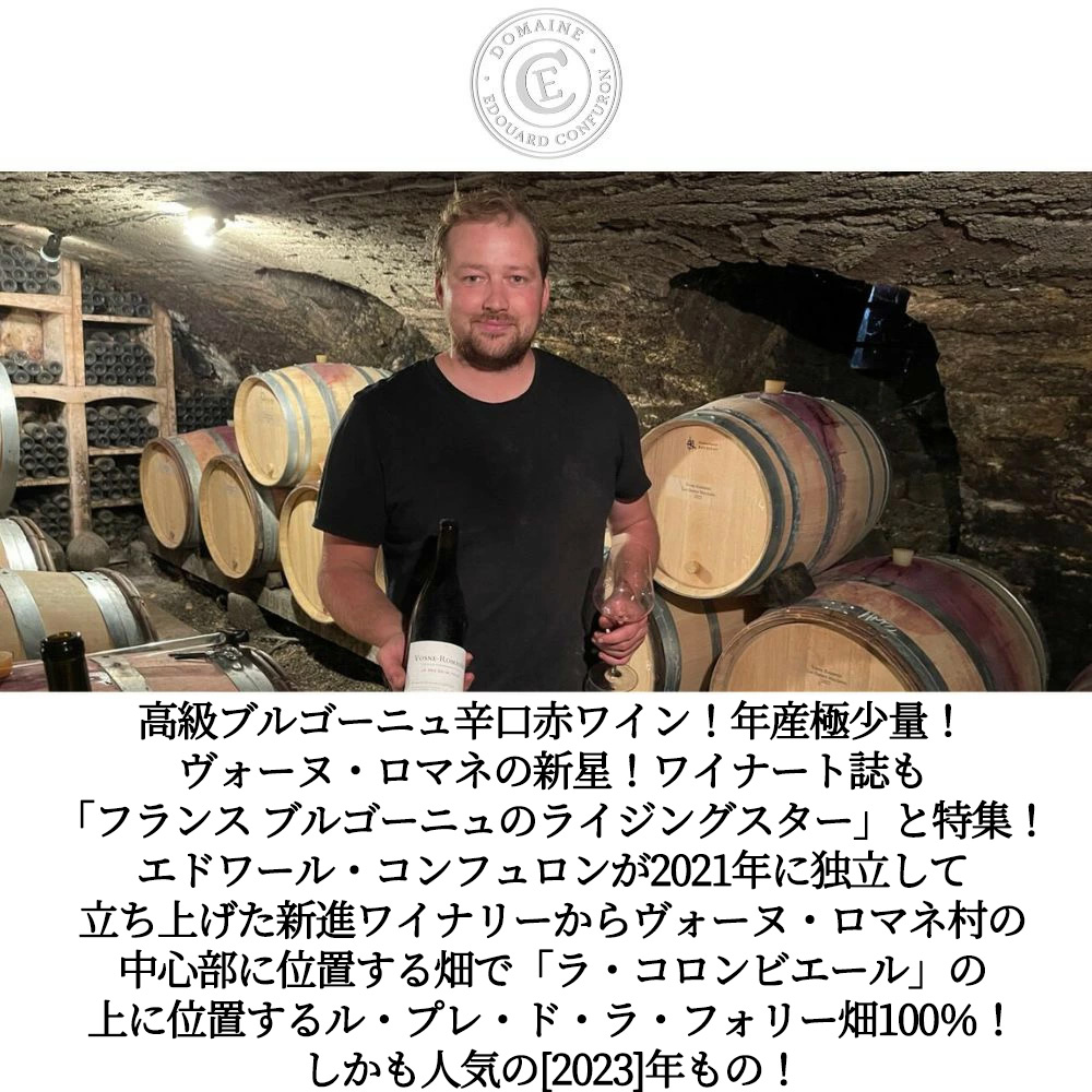 以下インポーターさんのコメントは『ヴォーヌ・ロマネはラ・ターシュ通り (Rue de la Tache) にワイナリーを構える「ドメーヌ・フランソワ・コンフュロン・ジャンドル」。フランソワがドメーヌを引き継いだのは1984年のことです。弊社が輸入を開始したのは1997年で、28年目のお付き合いとなります。その住所の通り、ラ・ターシュを始めとするグラン・クリュが目と鼻の先にありますが、当主のフランソワはそんなことはお構いなしの「農夫」で、ワインの価格にも彼の性格が反映されています。フランソワのワインは原則として除梗し、しっかりとした抽出を行い、ヴィンテージの特徴をありのままに表現するスタイルです。それでいて高く評価されており、例えばマスター・オブ・ワインでブルゴーニュワインの権威として知られるジャスパー・モリス・MW は、フランソワの「エシェゾー・グラン・クリュ・2022」を94-97点と評価しています。一方、「ドメーヌ・エドワール・コンフュロン」は、フランソワの息子エドワールが2021年に独立して立ち上げたワイナリーです。その動機は、「父とは違うワイン造りがしたかった」からだといいます。エドワールは1994年生まれ。2014年からフランソワ・コンフュロン・ジャンドルに参加しており、弊社が現地を訪問する際には、父のドメーヌと自身のドメーヌをエドワールがそれぞれ案内してくれます。『ワイナート111号』の特集記事「フランス ブルゴーニュのライジングスター」で紹介された際、エドワールは「父はタニックでストラクチャーのしっかりしたワインが好みなので、抽出の強いワインを造っています。僕はもっとフィネスの感じられるワインを造りたいんです」と話しています。ファーストヴィンテージの2021VTはあまりにも量が少なく、2022VTからの取り扱いとなりました。しかし、2023年も畑面積は約1.5haしかなく生産量もごくわずかのため、数量限定でのご案内となります。』