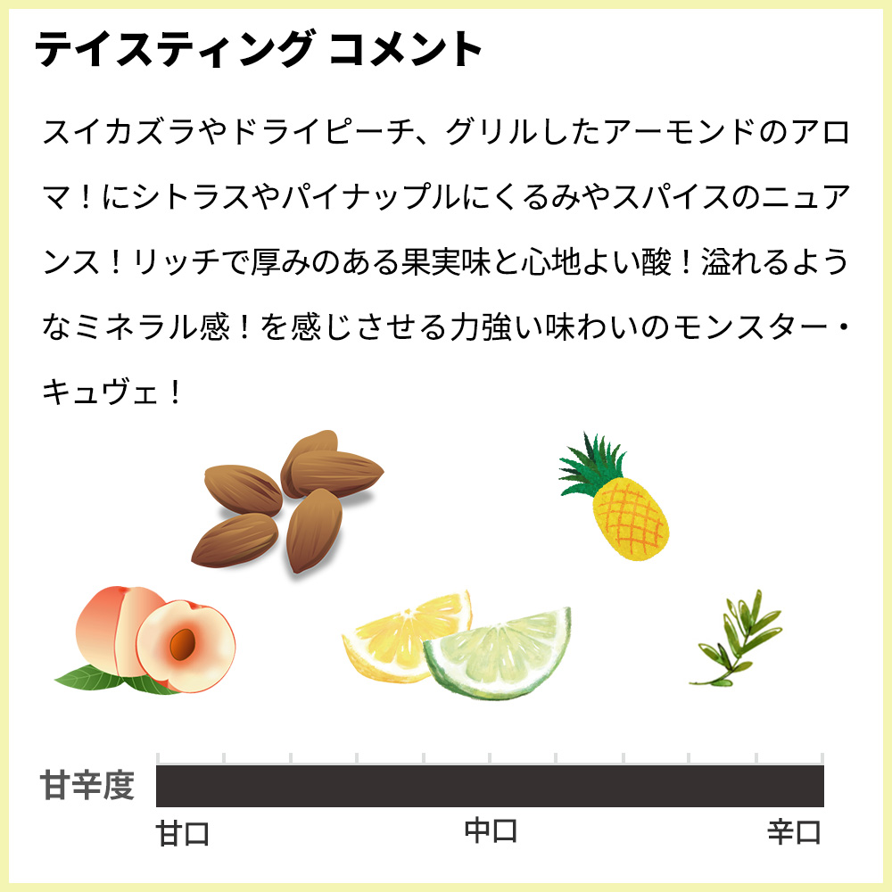 スイカズラやドライピーチ、グリルしたアーモンドのアロマ!にシトラスやパイナップルにくるみやスパイスのニュアンス!リッチで厚みのある果実味と心地よい酸!溢れるようなミネラル感!を感じさせる力強い味わいのモンスター・キュヴェ!ずば抜けた究極AOCヴィレ・クレッセのスペシャル・キュヴェ!