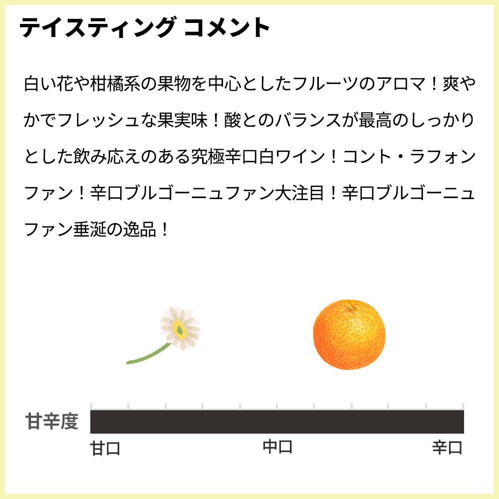 白い花や柑橘系の果物を中心としたフルーツのアロマ!爽やかでフレッシュな果実味!酸とのバランスが最高のしっかりとした飲み応えのある究極辛口白ワイン!コント・ラフォンファン!辛口ブルゴーニュファン大注目!辛口ブルゴーニュファン垂涎の逸品!