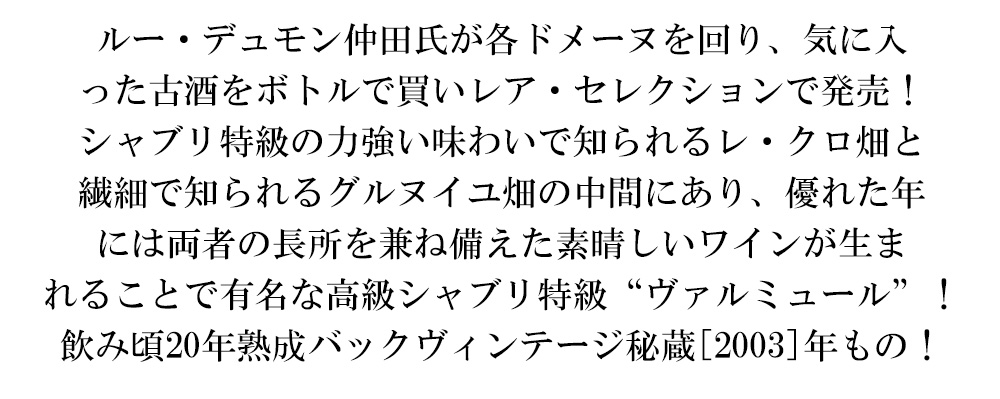 シャブリ グラン クリュ 特級 ヴァルミュール 2003 秘蔵特別輸入品ルー デュモン レア セレクション AOCシャブリ グラン クリュ 20年熟成 高級ブルゴーニュ,級シャブリ・グラン・クリュ・特級辛口白ワイン!! 特級畑のヴァルミュールと言えば、シャブリ特級の力強い味わいで知られる“レ・クロ”畑と、繊細で知られる“グルヌイユ”畑の中間にあり、優れた年には両者の長所を兼ね備えた素晴らしいワインが生まれることで有名な超人気特級畑! 造り手は、あの『神の雫』にも登場!NHKの「プロフェッショナル 仕事の流儀」にも登場!フランス、アシェットガイド誌にも掲載! まさに素晴らしい古酒の醍醐味を堪能させてくれる究極の逸品!