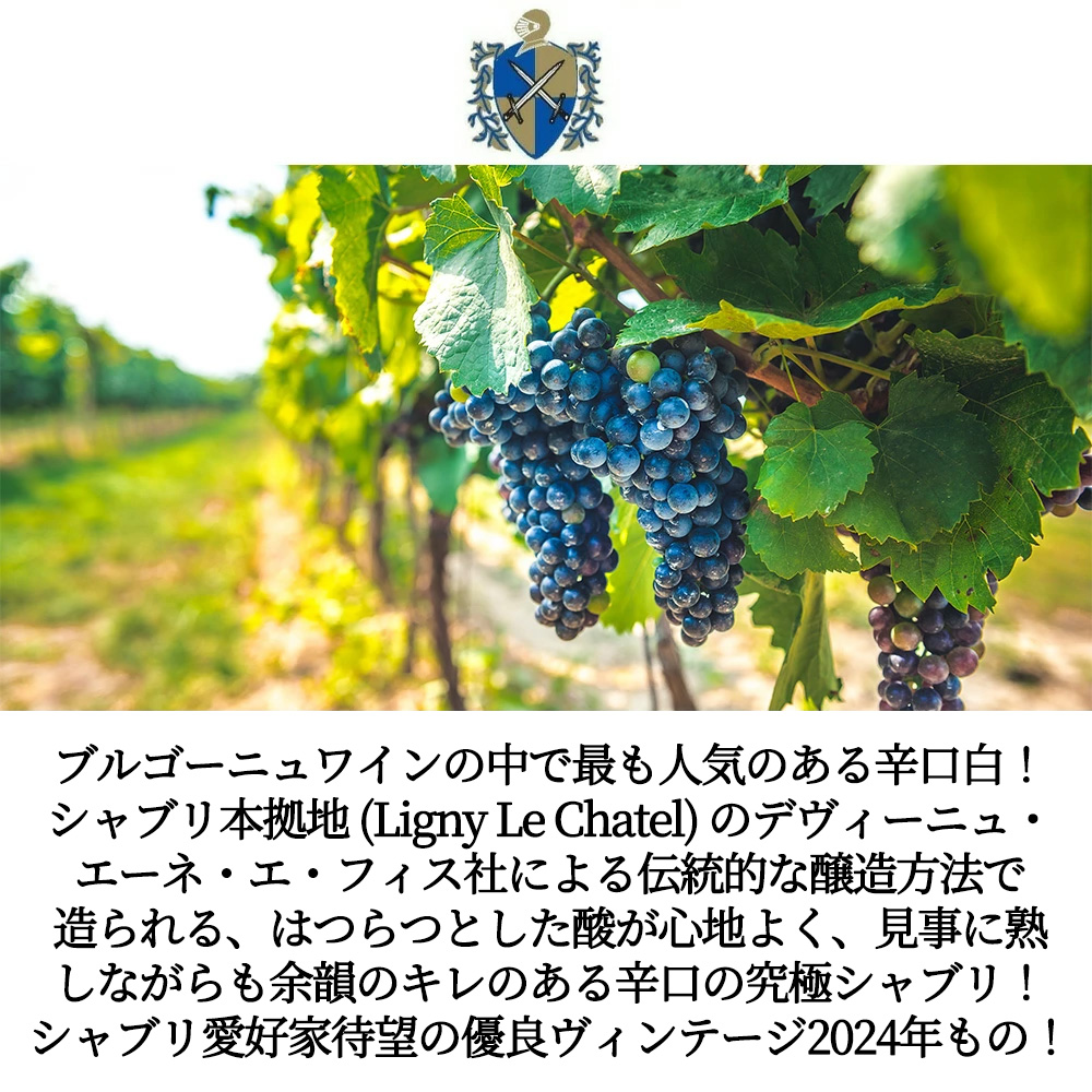 フルーティーでフレッシュな柑橘系の香りが楽しめる、キリッと引き締まった辛口の味わいで最も人気がある白ワイン。造り手はシャブリが本拠地(Ligny Le Chatel)のデヴィーニュ・エネ・エ・フィス社。レモンのしずく、オレンジの皮(オレンジビター)やグレープフルーツの魅力的な香りに、ライムやフレッシュな香り等、アロマチックでキリッと引き締まった味わいが詰まった生き生きとした個性。溌剌とした酸が心地よく残るキレのあるシャブリ。