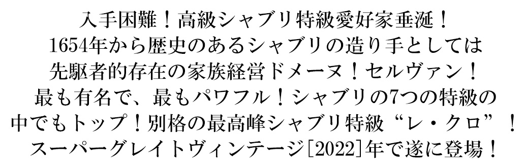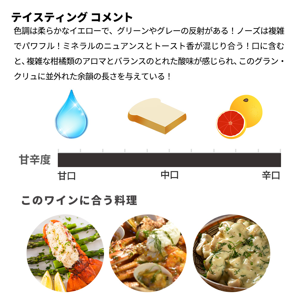 色調は柔らかなイエローで、グリーンやグレーの反射がある!ノーズは複雑でパワフル!ミネラルのニュアンスとトースト香が混じり合う!口に含むと、複雑な柑橘類のアロマとバランスのとれた酸味が感じられ、このグラン・クリュに並外れた余韻の長さを与えている!