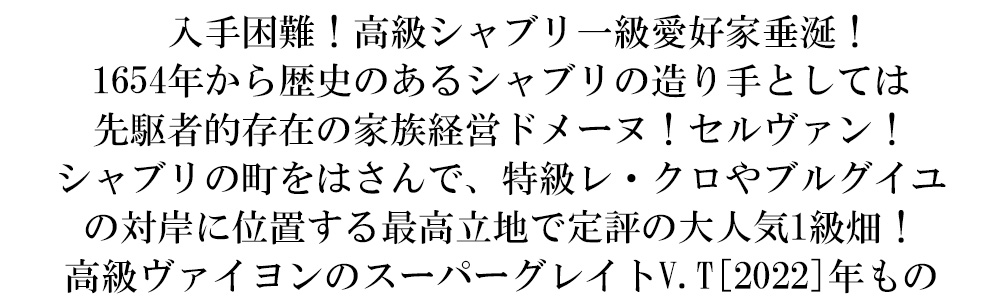 シャブリの名門!1654年から歴史のあるシャブリの造り手としては先駆者的存在の家族経営のドメーヌ!第23回シャブリ・ワイン・アワードにおいて最高評価を獲得し、150本のシャブリの中で最上の1本に選ばれた経歴をもつドメーヌ・セルヴァン!