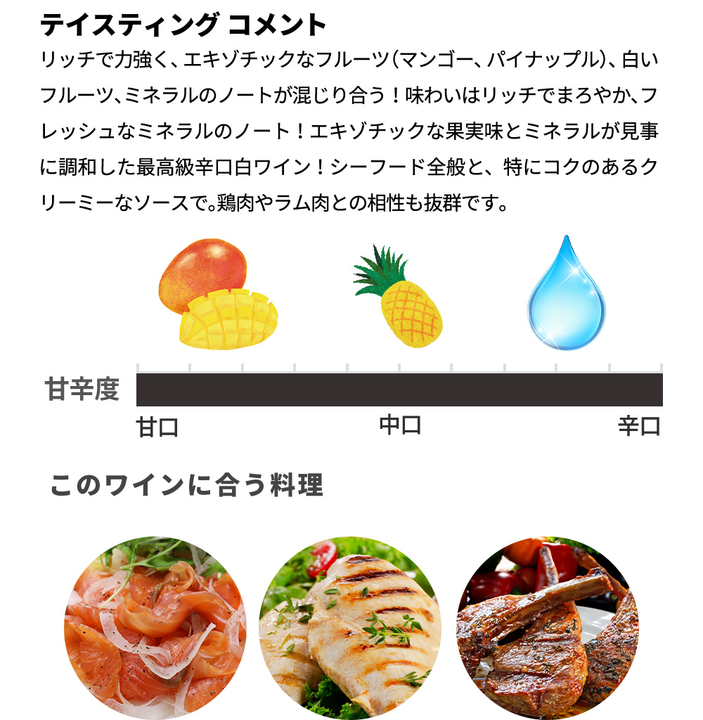 白い輝きを持つ柔らかな黄色!香りはリッチで力強く、エキゾチックなフルーツ(マンゴー、パイナップル)、白いフルーツ、ミネラルのノートが混じり合う!味わいはリッチでまろやか、フレッシュなミネラルのノート!エキゾチックな果実味とミネラルが見事に調和した最高級辛口白ワインがスーパーグレイトヴィンテージ[2022]年で待望少量入荷!シーフード全般と、特にコクのあるクリーミーなソースで。鶏肉やラム肉との相性も抜群です。
