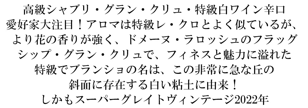 この2022VTの特級シャブリ・ブランショ・蔵出し作品・ドメーヌ・ラロッシュ元詰で、ワインスペクテーター誌でも驚異の91点の高評価!RVF誌2022年版でもこのブランショが94点の高評価!!