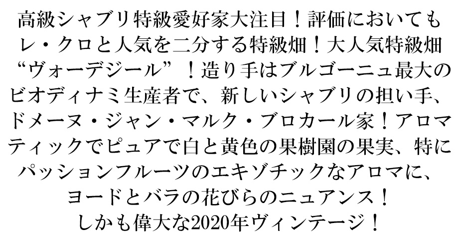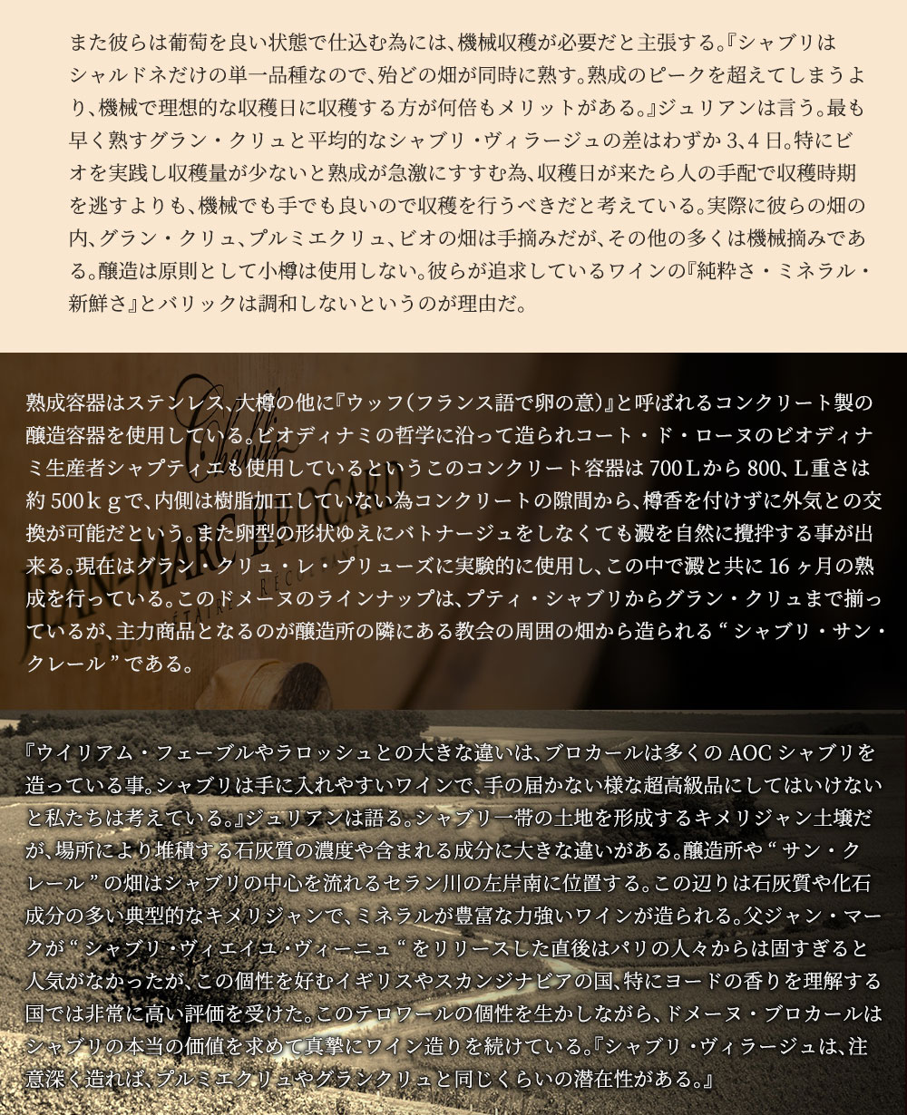 緑がかった輝きのある黄金色!柑橘の香り、ユリ、カモミールを思わせる繊細な花の香り!程よい酸が心地よく、シャブリ・グラン・クリュらしい豊かなミネラル感が楽しめる!