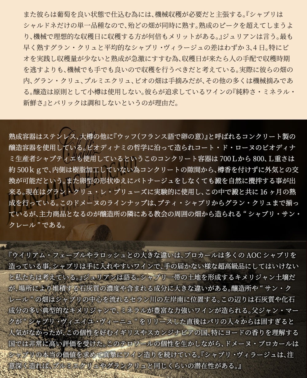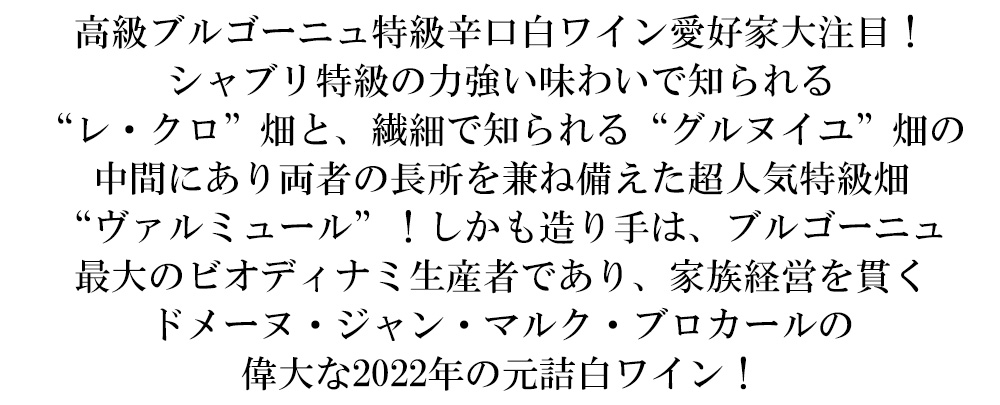 自然派・有機オーガニック・ビオディナミのブドウをステンレスタンクで発酵後、大樽で澱と共に16ヶ月で造られるこの2022年にドメーヌ・ジャン・マルク・ブロカールのオーナー・ジュリアン・ブロカールいわく「シャブリのグラン・クリュ、ヴァルミュールは、北西向きと南向きという微妙な変化を持つ谷を形成している。バランスの取れたミネラルの特徴を持つヴァルミュールは、その力強さと驚くべき果実味によって堂々たる存在感を示している。ワインは緑がかった金色。柑橘系の豊かな香りとトーストのような香ばしさが混ざり合った複雑な香り。飲み口はバターのようなコクと濃いミネラルが味わいの奥行きをつくりグラン・クリュの偉大さを感じさせてくれる。長期熟成にも耐えるポテンシャルを秘めたシャブリ特級」