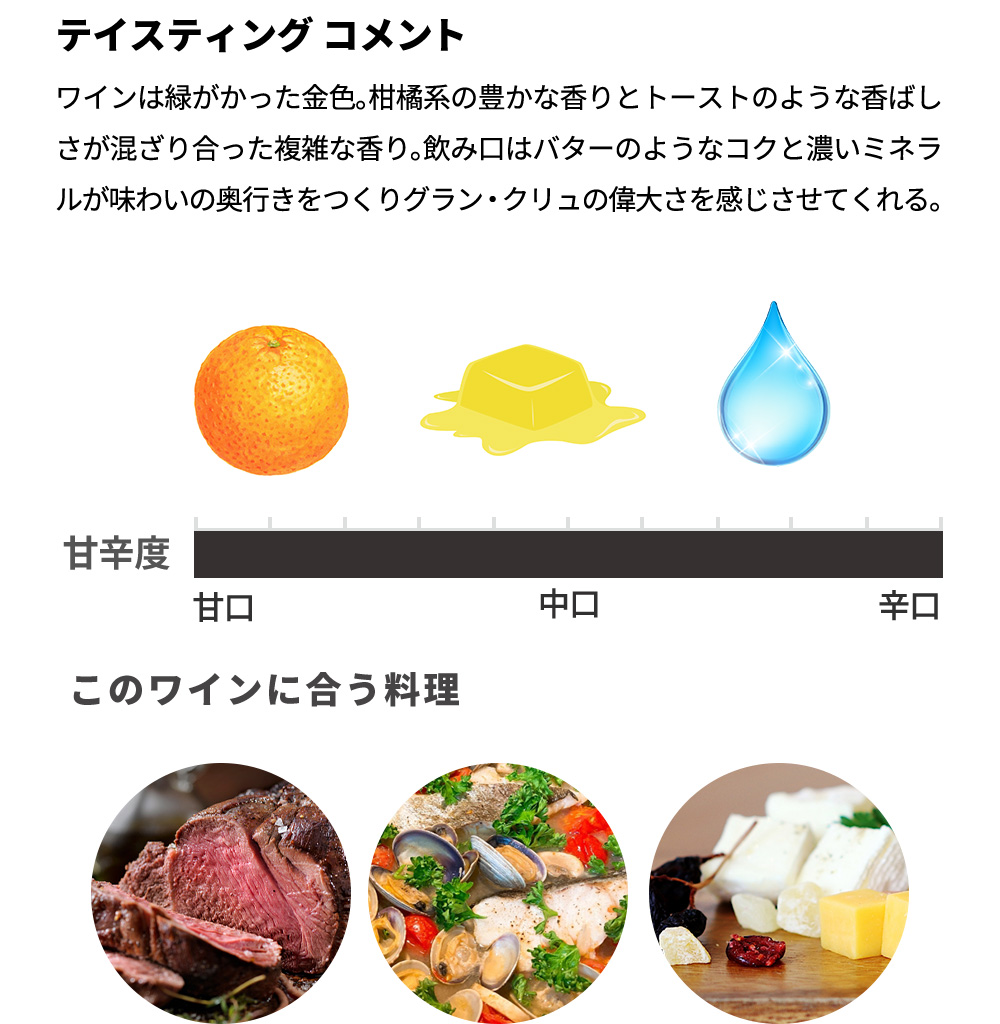 (相性の良い料理:鴨肉,貝類,グース,マッシュルーム,マンチェゴ&パルメザンチーズ,ジビエ,豚肉,カボチャ&根菜,鶏肉,七面鳥,チェダー&グリュイエール,肉厚魚&脂ののった魚,白身魚,貝類,カニ&ロブスター,クリームソース、サーヴ温度は12~14度で)と絶賛!の大人気シャブリ・グラン・クリュ・特級が限定で蔵出し作品で限定で極少量入荷!