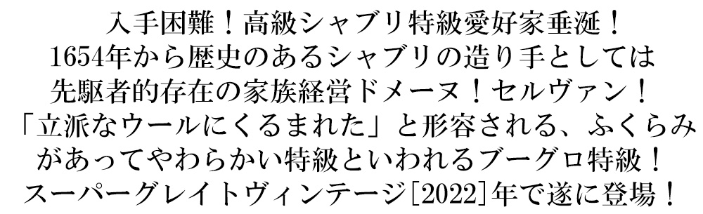ヴィノス誌驚異の92~94点でコメントは「2022年のシャブリ・ブグロ・グラン・クリュは、ブランショよりも複雑なブーケを持ち、ドライアプリコットや黄色い花の香りなど、より果実の深みがあり、印象的な活力と緊張感がある。口当たりはバランスがよく、わずかに蜂蜜がかった果実味とメロンやマンゴーのニュアンスを持つ調和のとれたフィニッシュに向かって、繊細な酸味がバランスをとっている。これは極上のワインになるだろう。」と激賞!