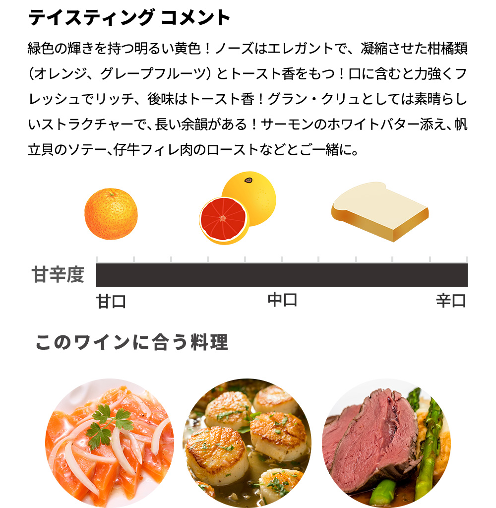 緑色の輝きを持つ明るい黄色!ノーズはエレガントで、凝縮させた柑橘類(オレンジ、グレープフルーツ)とトースト香をもつ!口に含むと力強くフレッシュでリッチ、後味はトースト香!グラン・クリュとしては素晴らしいストラクチャーで、長い余韻がある最高級辛口白ワインがスーパーグレイトヴィンテージ[2022]年で待望少量入荷!サーモンのホワイトバター添え、帆立貝のソテー、仔牛フィレ肉のローストなどとご一緒に。