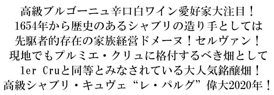 緑がかった明るい黄色!フレッシュで熟したパイナップル、ピーチ、柑橘類の香り!心地よいアタックと素晴らしい風味があり、口に含むとより柑橘系の風味が感じられます。とてもバランスが良くて、フレッシュな後口が続く、究極限定シャブリがスーパーグレイトヴィンテージ[2020]年でスクリューキャップ仕様で正規代理店輸入品の蔵出し品で限定少量入荷!