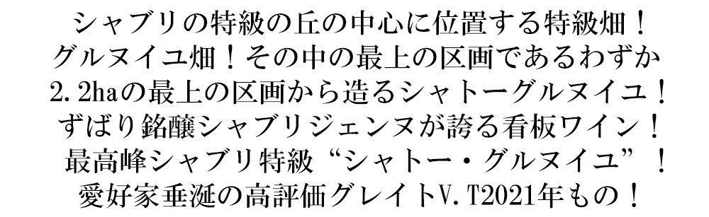 入手困難!ブルゴーニュ高級辛口白ワインファン大注目!高級シャブリ愛好家大注目!シャブリの女王!極上シャルドネ!シャブリのグラン・クリュの丘の中心に位置する特級グルヌイユ畑!その中の最上の区画であるわずか2.2haの最上の区画から造られるのが、この特級シャトーグルヌイユ!しかも待望の少量生産ながらグレイトヴィンテージの[2021]年もの!(偉大なブルゴーニュの大人気辛口白の最新ヴィンテージでグレイトヴィンテージ!なんと!フランス・アシェット・ガイド誌2024年版でも高評価のひとつ17/20点&ワインアドヴォケイト誌91点でOutstanding. Still tannic, youthful or slow to matureのコメントを付けるグレイトヴィンテージ[2021]年もの)が遂に入荷!造り手は、ロバート・パーカー★★★★4つ星生産者であり、アシェット・ガイド誌でも2銘柄が掲載!ベタンヌ&ドゥソーヴでW★★スター獲得!厳しい評価で知られるル・クラスマン誌は「以前から驚くほど品質が安定しており、難しい年でも例外はない。いずれも口当たりの良い健全な味のワインで(つまり収穫時の実の選別がきちんと行われているということである)、全体としてはきわめて繊細な造りであり、樽の使い方も見事である。このドメーヌのシャブリ・プルミエ・クリュを置いているレストランやブラッスリーは少なくないので、見つけたら迷わずお試しいただきたい。特級クラスのワインの中で特にお勧めしたいのは、純粋で洗練された味わいの『モン・ド・ミリュー』とこのドメーヌの看板である『シャトー・グルヌイユ』である。ワインは完璧な造りで長い余韻と奥深い味わいが楽しめる。」と絶賛!M.W.のセレナ・サトクリフ女史も「私は素晴らしいグラン・クリュのグルヌイユを手に入れたことがある」と大絶賛の人気造り手!質・量ともに最高レベルと評されるシャブリの銘醸造り手シャブリジェンヌが造るずばり看板シャブリ超人気特級畑(レ・クロに隣接するヴァルミュールとヴォーデジールに囲まれた特級畑で一番小さい超人気畑)グルヌイユ!キンメリジャン土壌からの平均樹齢40年以上の厳選シャルドネ100%を50%オーク樽(225L)/50%ステンレスタンク発酵!一部オーク樽熟成8ヶ月(225L、新樽比率10%)で造られる最高級辛口白ワイン!この[2021]年でワインスペクテーター誌堂々93点でコメントは「最初の印象はまろやかで、たっぷりとした桃、グレープフルーツ、メロン、火打石の風味がオークの軽いキスで縁取られている。鋼のような骨格が忍び寄り、余韻を引き締めている。」と大注目!さらにティム・アトキン驚異の94点高評価!その名のイメージとは対照的に、洗練された香りと凝縮感と力強さ、複雑さも味わえる究極の味わいのグラン・クリュ(特級)!シャブリの特級らしいエレガンスとシャブリしからぬ存在感を持つ、極上の味わい!非常に入手困難なシャブリ・グラン・クリュの高評価グレイトヴィンテージ[2021]年で正規代理店輸入品で極少量入荷!