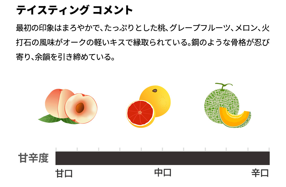 この[2021]年でワインスペクテーター誌堂々93点でコメントは「最初の印象はまろやかで、たっぷりとした桃、グレープフルーツ、メロン、火打石の風味がオークの軽いキスで縁取られている。鋼のような骨格が忍び寄り、余韻を引き締めている。」と大注目!