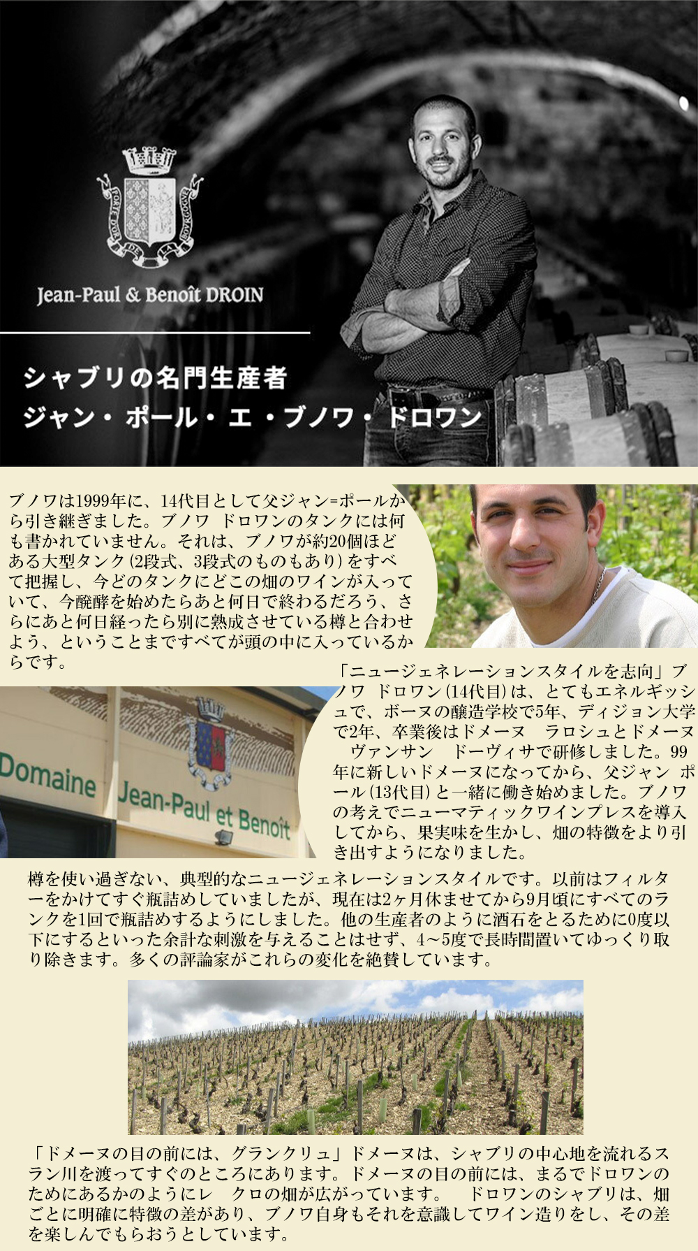 造り手はあるシャブリ地区の同じく素晴らしい生産者に「今一番いい生産者はドロワンだろう!」と、言わしめた造り手であり、「ワインアドヴォケイト」を始め、シャブリ特集には必ずといっていいほど登場し、ヒュー・ジョンソン氏「ポケットワインブック」に最高の生産者として掲載!「レ・メイユール・ヴァン・ド・フランス」で3つ星生産者(最高評価)!