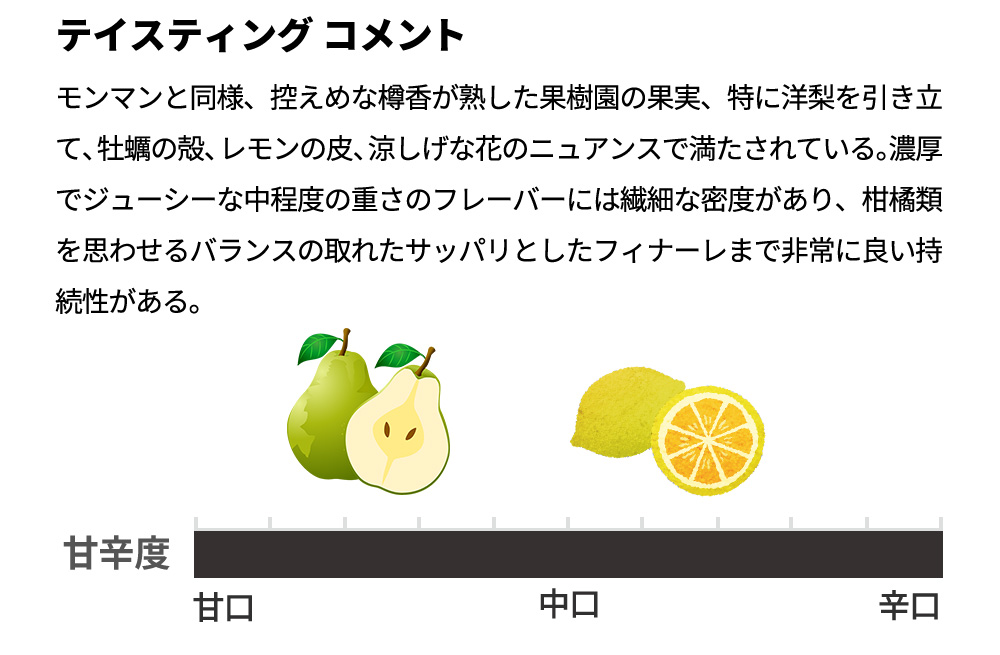 アランメドゥ・バーガウンド驚異の92点を獲得!絶賛コメントは『モンマンと同様、控えめな樽香が熟した果樹園の果実、特に洋梨を引き立て、牡蠣の殻、レモンの皮、涼しげな花のニュアンスで満たされている。濃厚でジューシーな中程度の重さのフレーバーには繊細な密度があり、柑橘類を思わせるバランスの取れたサッパリとしたフィナーレまで非常に良い持続性がある。ドロワンのワインはいつもそうであるように、このワインは非常にスタイリッシュである。90~92点(2028年+)』と絶賛!