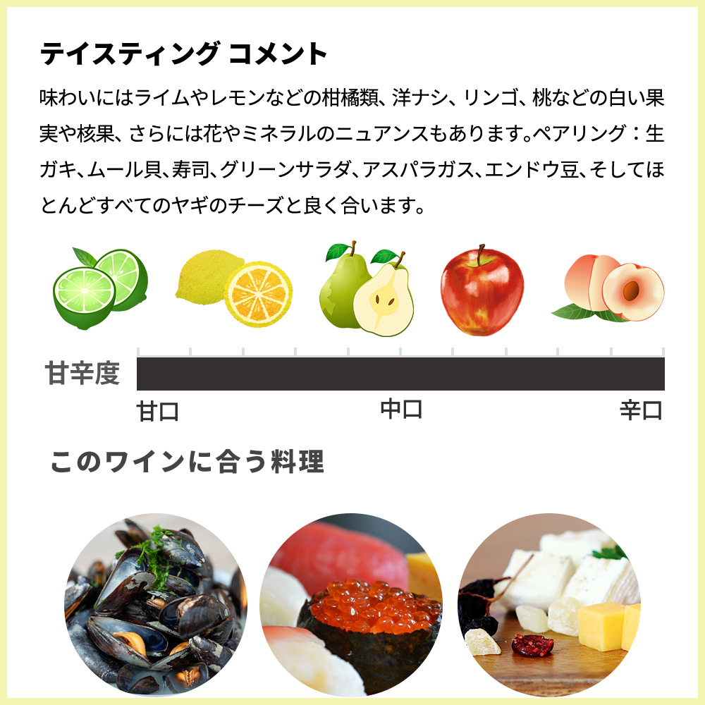 青みを帯びた輝く金色の外観に、花の香りなどのミネラルでフルーティなアロマが広がります。生き生きとした味わいが長く続き、甲殻類やグリルした白身肉などと良く合います。