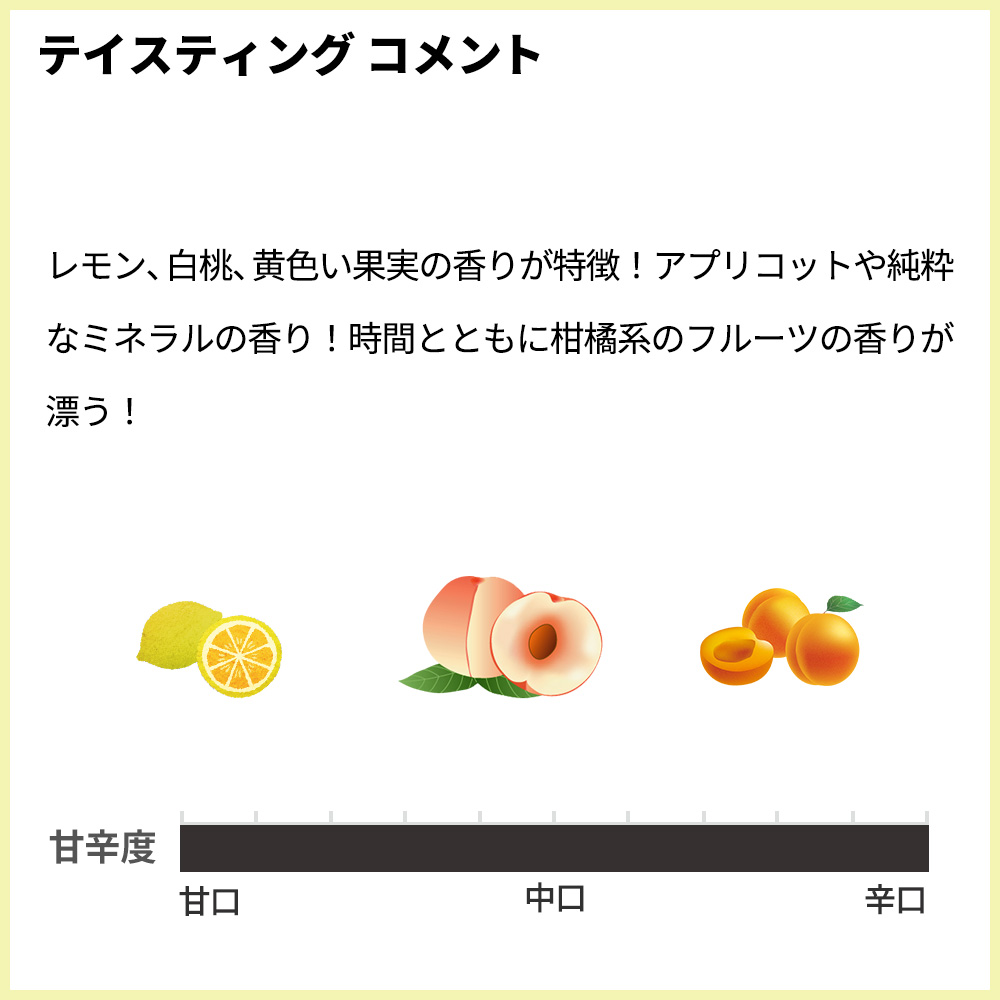 レモン、白桃、黄色い果実の香りが特徴!アプリコットや純粋なミネラルの香り!時間とともに柑橘系のフルーツの香りが漂う!口当たりは丸く、豊かな味わい!独特で円熟したワイン(レモン、白桃、黄色い果実の香り。まろやかで貪欲な味わい。緻密でまろやかなワイン。)が大人気ヴィンテージ2024年で正規品で限定入荷!