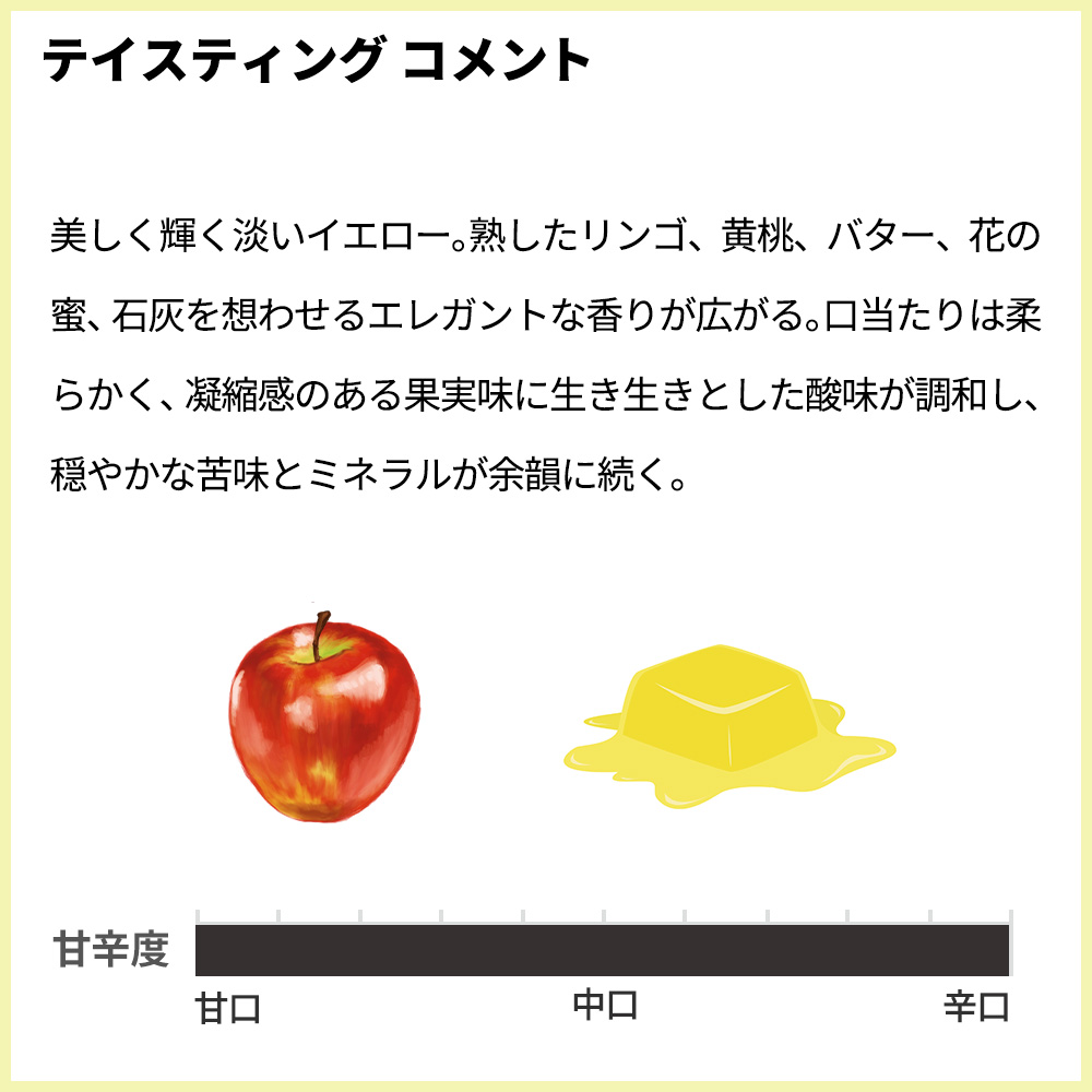美しく輝く淡いイエロー。熟したリンゴ、黄桃、バター、花の蜜、石灰を想わせるエレガントな香りが広がる。口当たりは柔らかく、凝縮感のある果実味に生き生きとした酸味が調和し、穏やかな苦味とミネラルが余韻に続く。クリーミーなテクスチャーが特徴の気品のあるシャブリです。
