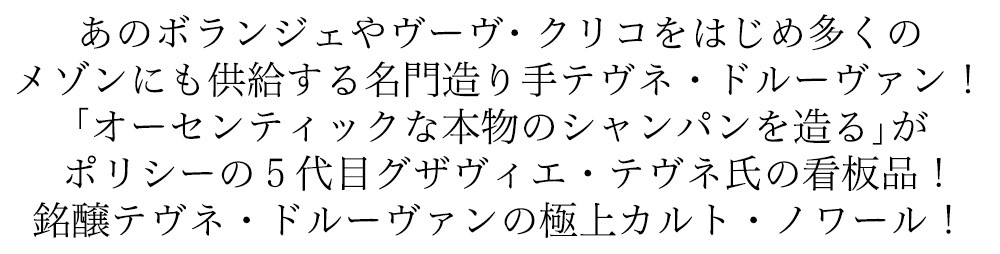 シャンパーニュ テヴネ・ドルーヴァン カルト・ノワール ブリュットPassy-Gaigny、Cerseuil、Troissyの三つの畑。粘土石灰質土壌の樹齢25年~35年のピノ・ムニエ90%とピノ・ノワール10%のブラン・ド・ノワール!現在販売中のものは2011年産70%、2010年産30%で、ドサージュが約9g/Lの本格派。