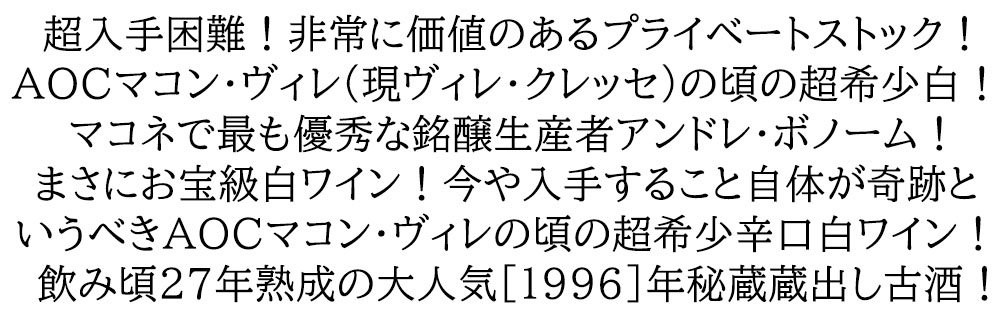 マコン・ヴィレ[1996]年 ■発酵・熟成:一年間樽と一年間ステンレスタンクにて熟成 ■樹齢:当時の樹齢は70年以上 ブルゴーニュの南部、マコネの中心地に位置する、しなやかさとミネラル感を併せ持つヴィレ・クレッセ村に1956年設立! わずか13haの畑から生産するマコネでも最も優秀な造り手!あの『神の雫』に登場! R.パーカー氏やワインスペクテーター誌、ステファン・タンザー「IWC」やヒュー・ジョンソン氏!ワインライター大絶賛!数々の世界的なコンクールで賞賛の嵐!その安定した素晴らしい造りに海外の超有名レストランなどのプロが認める数少ないドメーヌのひとつ! しっかりとした熟成感がありながらも酸や果実味も感じられ、若いヴィンテージでは決して味わえない古酒独特の深味のある味わいを備えています。ブルゴーニュの古酒好きの方にはぜひお試し頂きたいワイン! 非常に価値のあるプライベートストック!今ではまず味わうことができない幻のAOCマコン・ヴィレの頃の超希少辛口白ワインです!