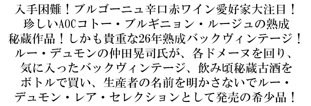 コトー ブルギニョン ルージュ レア セレクション 1999 秘蔵限定品 ルー デュモン レア セレクション AOCコトー ブルギニョン 赤 ■ぶどう品種:ピノ・ノワール/ガメイ/セザール 最もビックな年のひとつでブルゴーニュの赤の愛好者なら必ず飲んでみるべき年だ。」と大絶賛!ずばり貴重な26年熟成バックヴィンテージ[1999]年もの! コトー・ブルギニヨンは、北はシャブリから、コート・ド・ニュイ、コート・ド・ボーヌ、コート・シャロネーズ、マコネ、ボジョレーまで6産地のどのブドウからでも造ることができるためブルゴーニュワインでありながら非常にリーズナブルでコトー・ブルギニヨンはブドウをブレンドすることが認められている数少ないワインのひとつ!「造り手が表現したい味わい」を体験できるコトー・ブルギニヨン! 格が高騰するブルゴーニュながらも、ブルゴーニュの様々な可能性を感じることができるコトー・ブルギニヨンの魅力を楽しめる1本になるかもしれません!