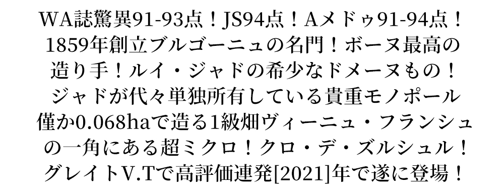 ルイ・ジャドの手によって造られたこの一級畑ワインは、クロ・デ・ズルシュールとして知られ、ピノ・ノワールを使用しています。その味わいはブラックチェリーやスパイス、赤い果実のアロマが豊かで、タンニンもきめ細やかで調和が取れた辛口赤ワインです。