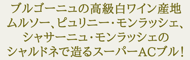 ブルゴーニュ ブラン エモーション 2021年 ヴァンサン・ジラルダンブルゴーニュの高級白ワイン産地であるムルソー、ピュリニー・モンラッシェ、シャサーニュ・モンラッシェのシャルドネをブレンド。キュヴェ・サン・ヴァンサンより更にリッチな味わいのエモーション。「村名ワインのブラインド・テイステイングにこっそり出すと“素晴らしいシャサーニュですね”“素晴らしいムルソーですね”と言う方がおられます」とマルコ・カスケーラ氏。味わいには酸味もしっかり感じられ、アロマも充分にありピーチやアプリコットなどの熟した果実全般のアロマが感じられる、スーパー・ブルゴーニュ・シャルドネ。