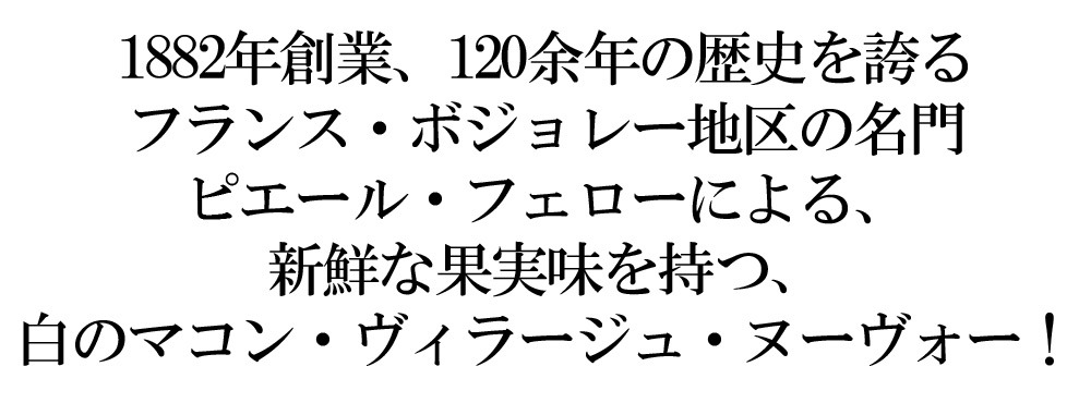 ピエール・フェロー社のヌーヴォーは、土壌とぶどうの個性を最大限生かしたワイン造りをモットーにしています。若々しく、フレッシュな味わいがボージョレーの持ち味ですが、ピエール・フェロー社のヌーヴォーは、輝きのある美しいルビー色をしていて、赤いベリー系果実の風味がとても豊か。酸のバランスもとても良いのが特徴。『これぞボージョレー・ヌーヴォー!』といったワインをお楽しみいただけるはずです。
