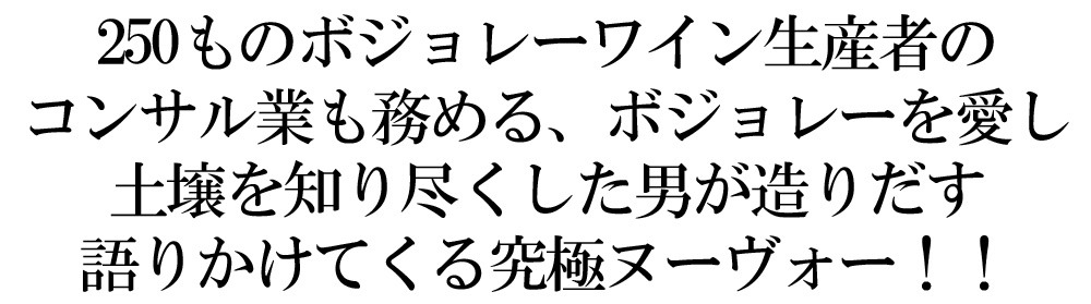 5.50ヘクタールの畑をジュエリナに、そして3・2ヘクタールをボージョレ・ヴィラージュに持っています。砂が多く、また花崗岩質の彼の土壌からできる彼のぶどうはよく熟し、アロマティックなワインが出来上がります。ドリー氏はボージョレー・ヴィラージュではほとんどが60~80歳の古樹(ヴィエイユ・ヴィーニュ)で、ゴブレ式の幹が出来上がっています。 畑はほとんどが樹齢60~80年のヴィエイユ・ヴィーニュ。砂と花崗岩質の土壌から、ぶどう果ひと房ひと房まで手入れが行き届いたぶどうはよく熟し、凝縮感溢れるアロマティックなワインが出来上がります。 この自らの畑で毎年素晴らしいワインを生み出す傍ら、ドリー氏は250ものボジョレーワイン生産者のコンサルティングも勤めており、まさにこの地のワインの品質向上の立役者。 ボジョレーを愛し、飽くなき探究心と好奇心によって土壌を知りつくした男の造り出す、語りかけてくるワインです。