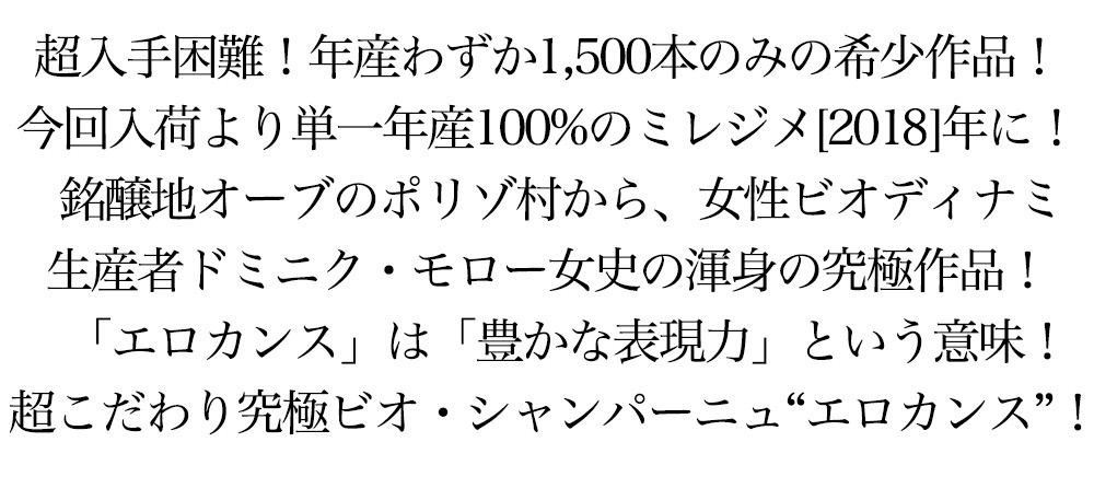 シャンパーニュ マリー・クルタン エロカンス エクストラブリュット ブラン・ド・ブラン 造り手の中のレンジでは非常に珍しいブラン・ド・ブラン(シャルドネ100%)の年産わずか1,500本のみ造られる超限定生産シャンパーニュ!ポリゾ村の平均樹齢25年のシャルドネ100%のブラン・ド・ブラン!100%をブルゴーニュ樽で発酵・熟成! ポリゾ村の平均樹齢25年のシャルドネ100%のブラン・ド・ブラン!100%をブルゴーニュ樽で発酵・熟成!しかもエクストラ・ブリュット表記ながら、ドサージュ・ゼロのノン・ドゼ。 しかもエクストラ・ブリュット表記ながら、ドサージュ・ゼロのノン・ドゼ! キュヴェ名の「エロカンス」は「豊かな表現力」という意味です 。 ミレジム(単一年産)100%!熟成したシャルドネならではの、ブリオッシュのような香ばしい風味をご堪能いただける、ドミニク・モロー女史渾身の作!