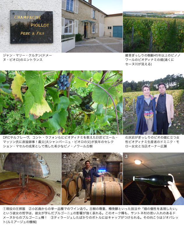 フランソワーズ・ベデルを彷彿とさせる女性ビオディナミ生産者が、オーブに誕生しました。挑むはオーブの魂、ピノ・ノワール100%によるブラン・ド・ノワール。「子供の頃から、化学薬品をまったく受けつけない体質でした。病気になったら、ホメオパシーなどで治癒していました」というドミニク・モローが、女性ヴィニュロンヌとしての人生を選択した時、最初からビオディナミを志向したのは当然の成り行きでした。DRC、ルフレーヴ、コント・ラフォン、ディディエ・モンショヴェらにビオディナミを教えた巨匠ピエール・マッソンに直接師事。ポリゾ村のRM、Piollot Pere et Filsに嫁いでオーブに来てからは、シャンパーニュにおけるビオディナミの先駆者ジャン・ピエール・フルーリーや、ベルトラン・ゴートロらとの交友を育みながら、夫から譲り受けた畑で実地に栽培実験を行ってきました。