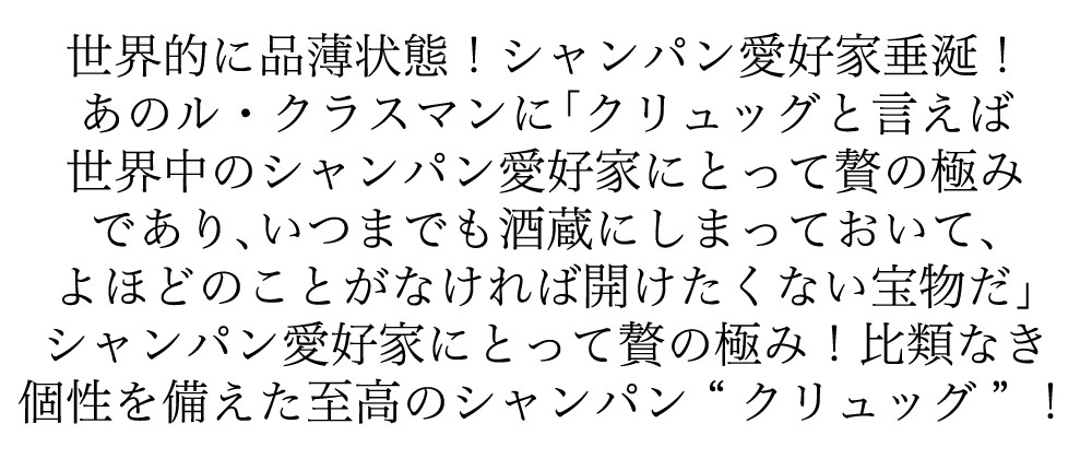 クリュッグ・シャンパーニュ“グラン・キュヴェ”ブリュット “クリュッギスト”(クリュッグの信奉者の名)愛好家も存在する、ルイ・ヴィトン・グループ所有の希少シャンパーニュ!ロバート・パーカー満点★★★★★5つ星生産者であり、ゴーミヨ誌満点5つ星生産者で、あのクラスマン誌に「クリュッグと言えば世界中のシャンパン愛好家にとって贅の極みであり、いつまでも酒蔵にしまっておいて、よほどのことがなければ開けたくない宝物だ」と言わしめた究極シャンパーニュ! しかもこのグラン・キュヴェについては「柑橘類の砂糖漬けのような香りが特徴で爽やかさといい余韻の長さといい申し分ない」と激賞! 6~10年にわたる収穫年の異なる120種類以上のワインをブレンドし、力強さと複雑さ、豊かさと清々しさのバランスが素晴らしい最高峰シャンパーニュ!マルメロや蜂蜜、ブリオッシュの香り!独特の新鮮さと深いミネラル香!しっかりした味わいと長く申し分ないアフターテイストの究極高級シャンパーニュ!