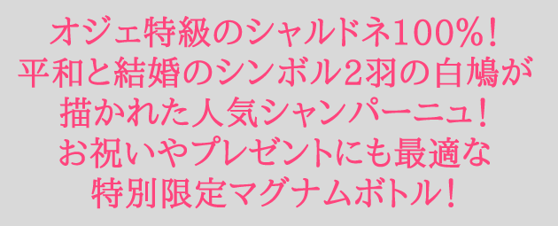 桃やメロンを思わせるリッチで豊満な味わいが特徴的なオジェのシャルドネ100%で醸される「愛し合うふたりのためのシャンパーニュ。」「キュヴェ・デ・ザムルー」は、「愛し合うカップルのためのキュヴェ」という意味です(フランスで鳩は結婚のシンボル)。2羽の白鳩がキスをしているシックで落ち着いた雰囲気のハート型のエチケットがおとなのシャンパーニュを感じさせます。