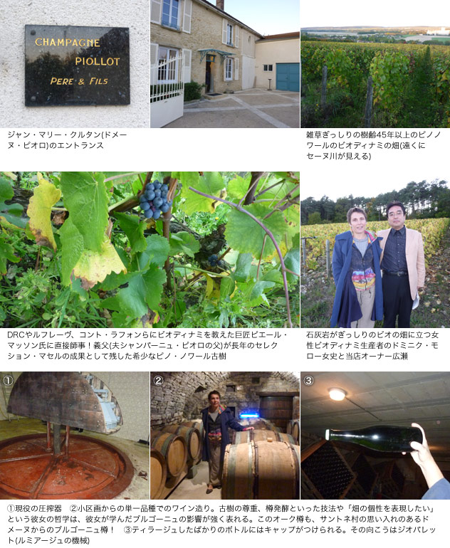 【フランソワーズ・ベデルを彷彿とさせる女性ビオディナミ生産者が、オーブに誕生しました。挑むはオーブの魂、ピノ・ノワール100%によるブラン・ド・ノワール。 「子供の頃から、化学薬品をまったく受けつけない体質でした。病気になったら、ホメオパシーなどで治癒していました」というドミニク・モローが、女性ヴィニュロンヌとしての人生を選択した時、最初からビオディナミを志向したのは自然な成り行きでした。【「DRC」、「ルフレーヴ」、「コント・ラフォン」、「ディディエ・モンショヴェ」らにビオディナミを教えた巨匠ピエール・マッソンに直接師事。ポリゾ村のRM、「Piollot Pere et Fils」に嫁いでオーブに来てからは、シャンパーニュにおけるビオディナミの先駆者ジャン・ピエール・フルーリーや、ベルトラン・ゴートロらとの交友を育みながら、夫から譲り受けた畑で実地に栽培実験を行ってきました。「私にとって本当に幸いだったのは、義父が、1970年からのセレクション・マサル(マス選抜)の成果として、素晴らしいピノ・ノワールの古樹を残してくれたことです。ビオディナミによって、古樹のポテンシャルをさらに深いところから引き出すことができました」(ドミニク・モロー)。【小区画からの単一品種でのワイン造り、古樹の尊重、樽発酵といった技法や、「畑の個性を表現したい」という彼女の哲学には、彼女が学んだブルゴーニュの影響が強く表れています。 尚、メゾン名の「マリー・クルタン」は、同じくぶどう栽培家だった彼女のひいおばあさんの名前で、農薬や化学肥料を一切使用せず、馬による耕作を行っていたマリーさんへの敬意を込めて命名されたものです。