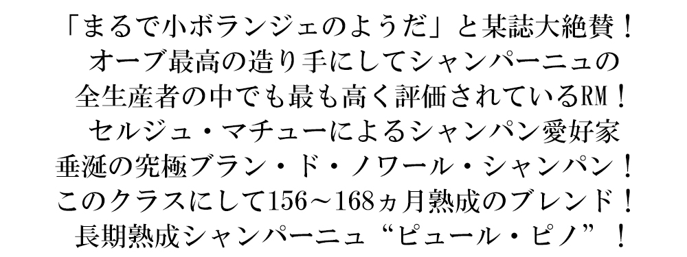 オーブ最高の造り手にして、シャンパーニュの全生産者の中でも最も高く評価されているRMのひとつ、セルジュ・マチュー。当主ミッシェル・ジャコブは実質ビオロジーの極めて厳格なリュット・レゾネ栽培に精魂込め、オーブならではのリッチで贅沢感のあるピノノワールとシャルドネをつくっています。