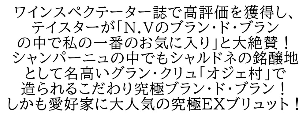 シャピュイ グラン クリュ 特級 エクストラ ブリュット ブラン ド ブラン シャンパーニュ ■ぶどう品種:シャルドネ100% ■熟成期間:瓶熟48ヶ月以上 ワインスペクテーター誌でも「ノンヴィンテージのブラン・ド・ブランで私の一番のお気に入り!」と絶賛し、ブリュットの方で高評価!Richard Juhlin“A scent of Champagne”でもWスターで大注目! 畑ごと、葡萄品種ごとに、別々のタンクで一次発酵させ、リキュール・デクスペディションはシャルドネをベースとしたリキュールのみを使用!このエクストラ・ブリュットは、瓶熟40ヶ月以上でデゴルジュマン!ドサージュ5g/Lの最辛口! 麦わらがかったゴールド、上品な泡立ち。フレッシュな柑橘系果実の香りと、蜂蜜やナッツ、ブリオッシュの香り。エクストラ・ブリュットらしいキレのある酸と、硬質なミネラル、自然な果実の味わいのバランスが絶妙な究極エクストラ・ブリュットでブラン・ド・ブランでグラン・クリュの究極シャンパーニュが限定で極少量入荷!
