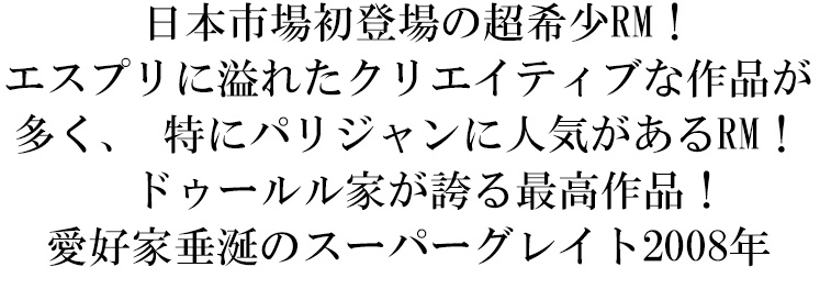 超入手困難!アシェットガイド誌2023年版驚異のWスター★★獲得造り手による前回即完売大人気ヴィンテージ・シャンパーニュ!単一年産100%ミレジムシャンパーニュ辛口愛好家大注目!R.M(生産者元詰)シャンパーニュファン大注目!しかもシャンパーニュ愛好家にとって入手したいスーパーグレイトヴィンテージのひとつの15年熟成バックヴィンテージで、ワインアドヴォケイト誌驚異の99点をつけさせたスーパーグレイトヴィンテージ2008年もの(e.ロバート・パーカーはシャンパーニュに驚異の99点のほぼ満点の高評価)!飲み頃15年熟成バックヴィンテージ!アシェット・ガイド誌2011年、2012年、2013年、2014年~2023年までほぼ毎年連続掲載!(2005年のミレジムはWスター★★獲得!) Le Point誌でも17/20点の高評価!日本市場初登場の超限定作品!マルセル・ドゥウールルの最高級品!飲み頃15年熟成スーパーグレイトのバックヴィンテージ!!造り手は19世紀末からオーブ県のセル・シュル・ウルス村にてぶどう栽培を営む老舗!1940年にR.Mを設立し、1980年にマルセル・ドゥウールルが継承し、現在の社名に!現在は息子のブノワ・ドゥウールルに世代交代し、さらに品質・人気ともに急上昇!また、ギィド・アシェットをはじめ専門誌でも掲載され大注目!エスプリにあふれたクリエイティブな作品が多く、特にパリジャンに人気があるR.M!なんと95%はフランス国内の個人愛好家に直行!残りの5%はイタリアやベルギー等近隣のEU各国に輸出!ほぼフランスで完売してしまう日本市場超限定シャンパーニュ!ブノワ氏のポリシーである「とにかくできるだけ長く畑にいて細かい自然の変化をつかみながら、最良のブドウを収穫すること。日曜日の午後に飲んで心から喜びを感じられるシャンパンを造りたい」を徹底し、実践!ブノワ氏がこだわりのもと作る、ドゥウールル家が誇る最高級ミレジム・シャンパーニュ!このミレジメ[2008]年は粘土石灰質土壌からの平均樹齢30年もののピノ・ノワール80%、ピノ・ブラン20%を、ステンレスタンクで醸造!動瓶は手作業100%!ドサージュ7g/Lの本格派辛口!しかも人気の2008年もの!単一年産100%(ヴィンテージ)シャンパーニュがお買得プライスでついに入荷!日本ではまず味わうことが出来ない究極ミレジム・シャンパーニュが現地のセラー数ヶ月前の蔵出しで、遂に極少量入荷