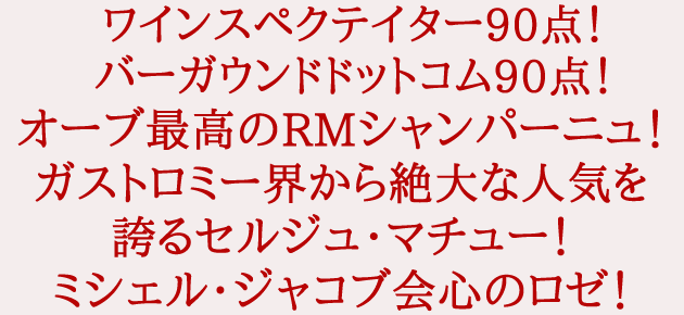 オーブ最高の造り手にして、シャンパーニュの全生産者の中でも最も高く評価されているRMのひとつ、セルジュ・マチュー。当主ミッシェル・ジャコブは実質ビオロジーの極めて厳格なリュット・レゾネ栽培に精魂込め、オーブならではのリッチで贅沢感のあるピノノワールとシャルドネをつくっています。