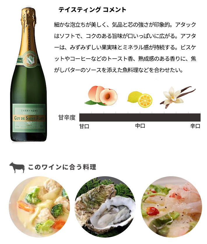 走れ続けるのには、理由があります。 シャンパンハウスの名門・ガルデ社が自信を持ってお届けする本格はの一本。上品な泡立ちとフレッシュな果実味を兼ね備え、味わいのバランスの良さは他の追随を許しません!さらに価格も大変お手頃。良質なシャンパーニュを気軽に楽しめます。華やかなイベントやパーティが多くなるこれからの季節。GUY DE SAINT-FLAVYはそんな楽しい憩いのひと時を、さらに素敵に盛り上げてくれるでしょう。