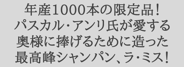 パスカル・アンリ氏が愛する奥様に捧げるために造った特別作品ラ・ミス。特級オジェの中でも特に素晴らしい区画のシャルドネを厳選。アールデコ風&エレガンス風のドレスを着た女性のきれいなラベル。
