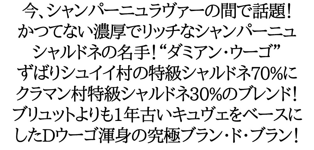 ダミアン・ウーゴ・シャンパーニュ・グラン・クリュ・ エクストラ・ブリュット・ブラン・ド・ブラン ぶどう品種:シャルドネ シュイイ村の特徴とも言える控えめな酸と、滑らかに広がる優しい果汁が、ダミアン・ウーゴの手によって、バランスの良い、洗練されたブラン・ド・ブランが完成する! また、シャンパーニュと言えば地下セラーが伝統的なメゾンのあり方でしたが、ダミアンは当時誰もが驚く平屋建ての醸造所を作り、話題を集めました。そして目と鼻の先にあるモエ・エ・シャンドンがダミアン・ウーゴに続く形で平屋建てセラーを設立しているところからも、斬新でありながら魅力的な生産者であることが伺い知れます! ずばりダミアン・ウーゴの究極エクストラ・ブリュット!「グラン・クリュ・エクストラ・ブリュット・ブラン・ド・ブラン」!自社畑100%で、シュイイ村特級のシャルドネを70%、クラマン村特級のシャルドネを30%ブレンドし、ブリュットよりも1年古いキュヴェをベースにした究極ブラン・ド・ブラン! 熟成期間はシュール・リーで36ヶ月!ドサージュは3.5g/Lの本格派辛口!白い花や柑橘系果実の香りが広がり、ブドウの厚みや果実感がしっかりありながら、フレッシュな味わい!ほどよい熟成感もあり、きれいな余韻が長く続く究極特級シャンパーニュ!