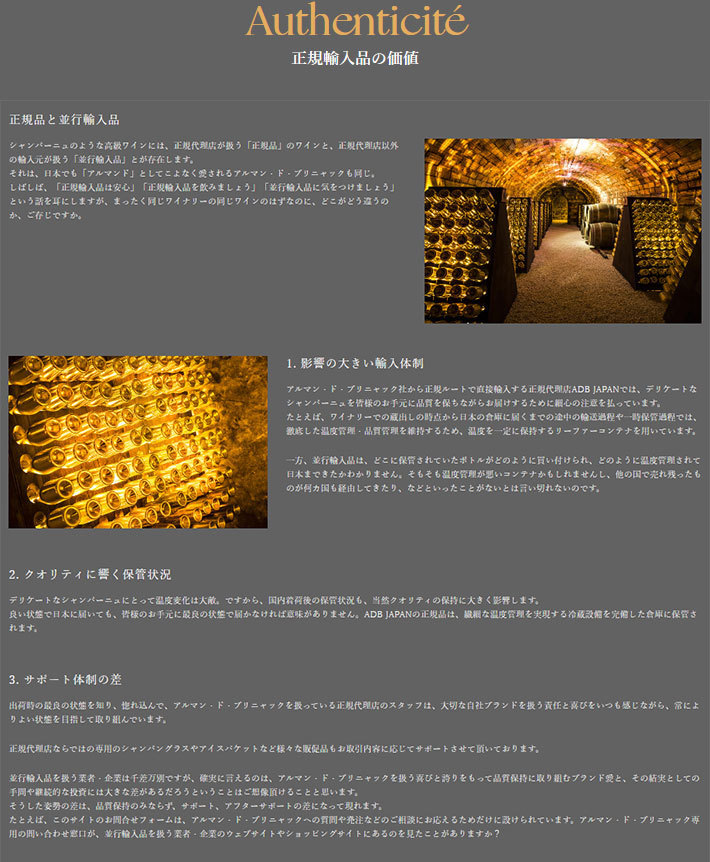 ブドウは収穫の初搾り分のみを使用し、2~3種のヴィンテージをブレンドします。ヴィンテージは伝統ある3種のブドウを使用し、ユニークなドサージュを行います。 12か月間、フレンチオークの樽で熟成されたアルマン・ド・ブリニャックは、地下30m以上の深さにあるセラーで出荷の時を待ちます。 アルマン・ド・ブリニャックは、HVE(Haute Valeur Environnementale /フランス農業・食糧省環境価値重視認定)で最高レベルであるレベル3を獲得しています。 生物多様性の尊重、植物病害虫防除対策、肥料・灌漑管理などの指標の遵守や検査をクリアした、自然環境と人の健康を守る持続可能な方法で、高品質のぶどう生産を継続していることが評価を受けているのです。