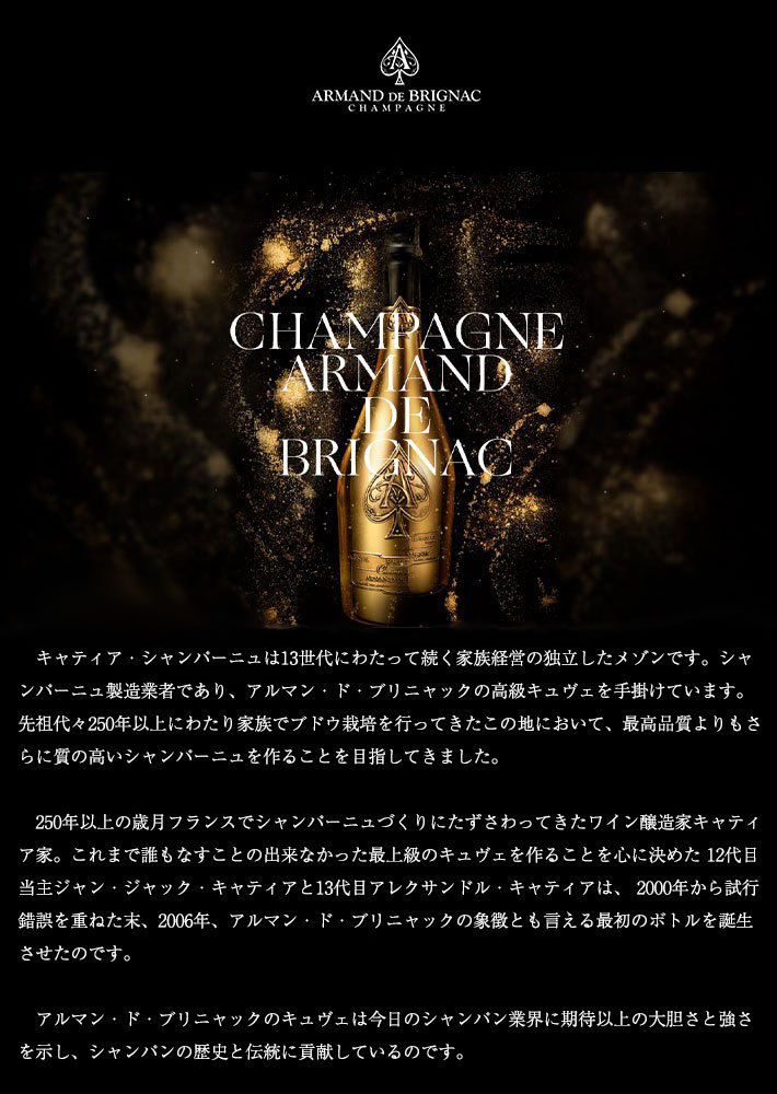 爆発大人気!超有名!超高級シャンパーニュ愛好家大注目!高級辛口シャンパーニュ愛好家垂涎!世界のセレブリティーに愛される魅惑のプレスティージュ・シャンパーニュ!しかも豪華手造りボトルのエースのスペードのゴールドメダルラベルがまぶしい究極ボトル入り!シャンパーニュファンのバイブルと呼ばれるRichard Juhlinsの「4000Champagne」でも3つ星生産者に選ばれている究極生産者!モンターニュ・ド・ランスで18世紀から歴史ある家族経営の生産者、“キャティア”による、2006年初リリースの究極スペシャル高級シャンパーニュ!アメリカではベッカム夫妻のロサンゼルス移住パーティーやジョージ・クルーニーのチャリティーパーティーで使用され、ラッパーのJAY-Zやトム・クルーズも愛飲!ハリウッドのセレブにも浸透!「100 Best Champagne for 2010」において、世界でも著名な評論家達やソムリエ達のブラインドテイスティングにより、世界ランキング第一位を獲得!ワインスペクテーター誌91点&ワインエンスージアスト誌91点!フォルスタッフ誌驚異の93点!厳選ピノ・ノワール40%にシャルドネ55%、ピノ・ムニエ20%使用!最も賞賛される地域のトリオヴィンテージで伝統的なシャンパーニュブレンドを行う事で生き生きとした新鮮な果実と複雑味を帯びたプレステージキュヴェを実現!砂糖漬けのシトラスやオレンジの花、ほのかなブリオッシュの後にピーチ、アプリコット、レッドベリーのアロマが続きます!チェリー、南国フルーツ、そしてレモン、バニラ、はちみつのなめらかさが口に広がります!アルマン・ド・ブリニャックの特徴であるフレンチオークで1年熟成させたリキュールでのドサージュにより、ほのかなトーストの香りと共に柔らかくクリーミーな口当たりが感じられる!非常に高級で入手困難なシャンパーニュが、高級シャンパーニュ愛好家大注目の逸品が正規代理店輸入品で、ギフト箱入りで限定で極少量入荷!しかも超豪華ブラックラッカー塗装で限定で極少量入荷!